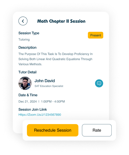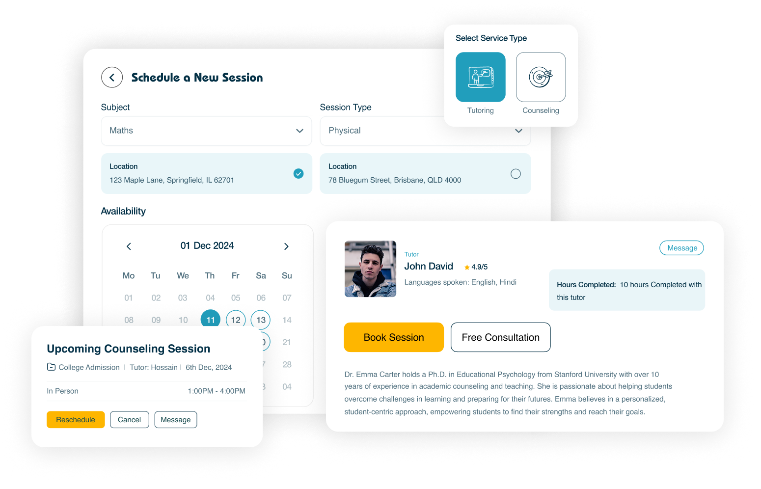Easily schedule private sessions, group classes, and workshops with just a few clicks. Reschedule or duplicate sessions in seconds, and empower students, parents, tutors, and counselors to book and manage their own sessions seamlessly.
