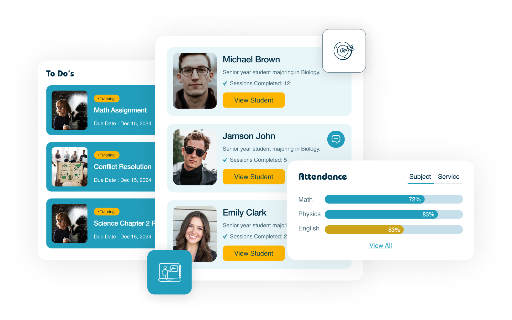 Streamline your database management and effortlessly stay connected with students, parents, tutors, and counselors. Complete profile view, in app communication, bulk messages, and much more.